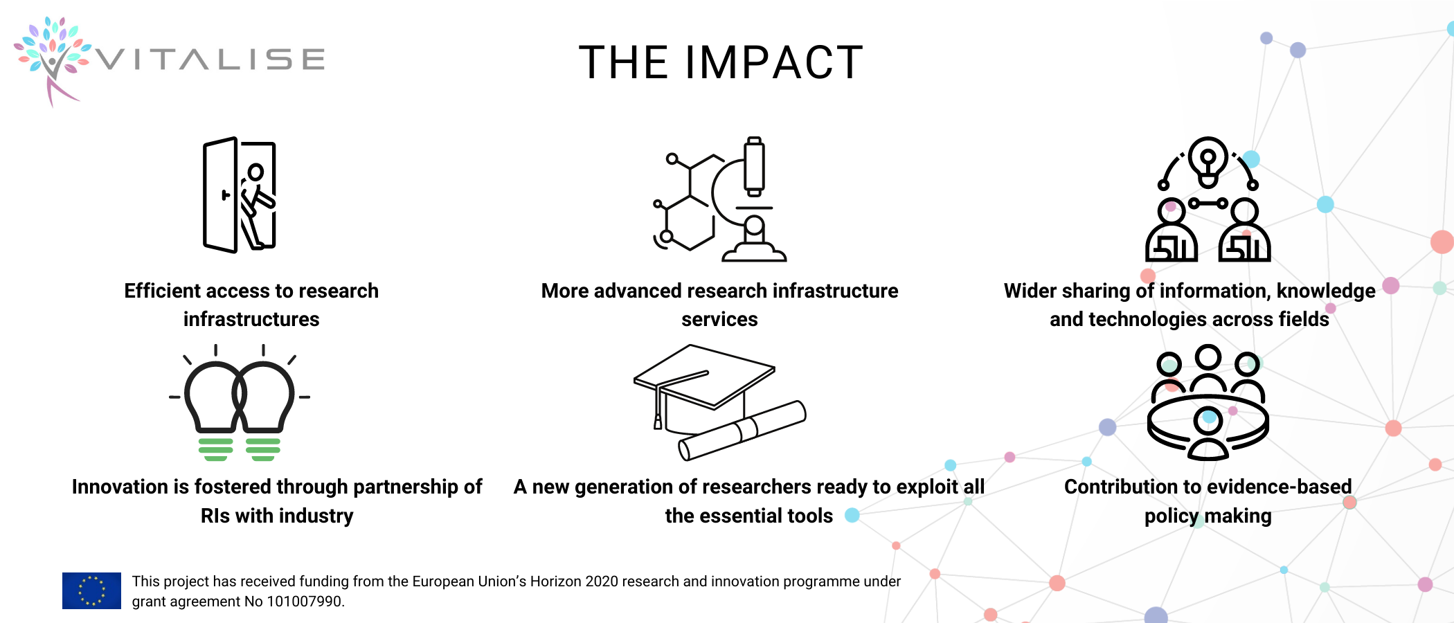 Within the broad domain of Health and Wellbeing, VITALISE focuses on Active and Healthy Ageing (AHA) domain and on chronic conditions and more specifically the following three main domains: rehabilitation, transitional care and everyday living environments aiming to identify and address the particular needs, provide solutions and collect data for further studies.